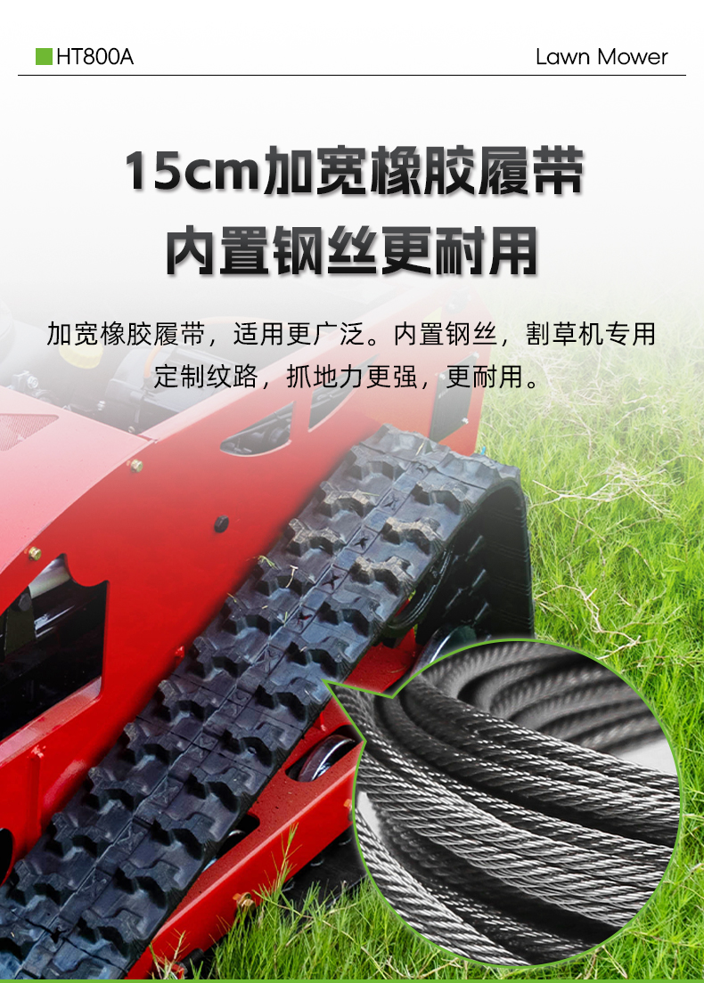 加寬橡膠履帶,適用更廣泛。內置鋼絲,割草機專用定制紋路,抓地力更強,更耐用。