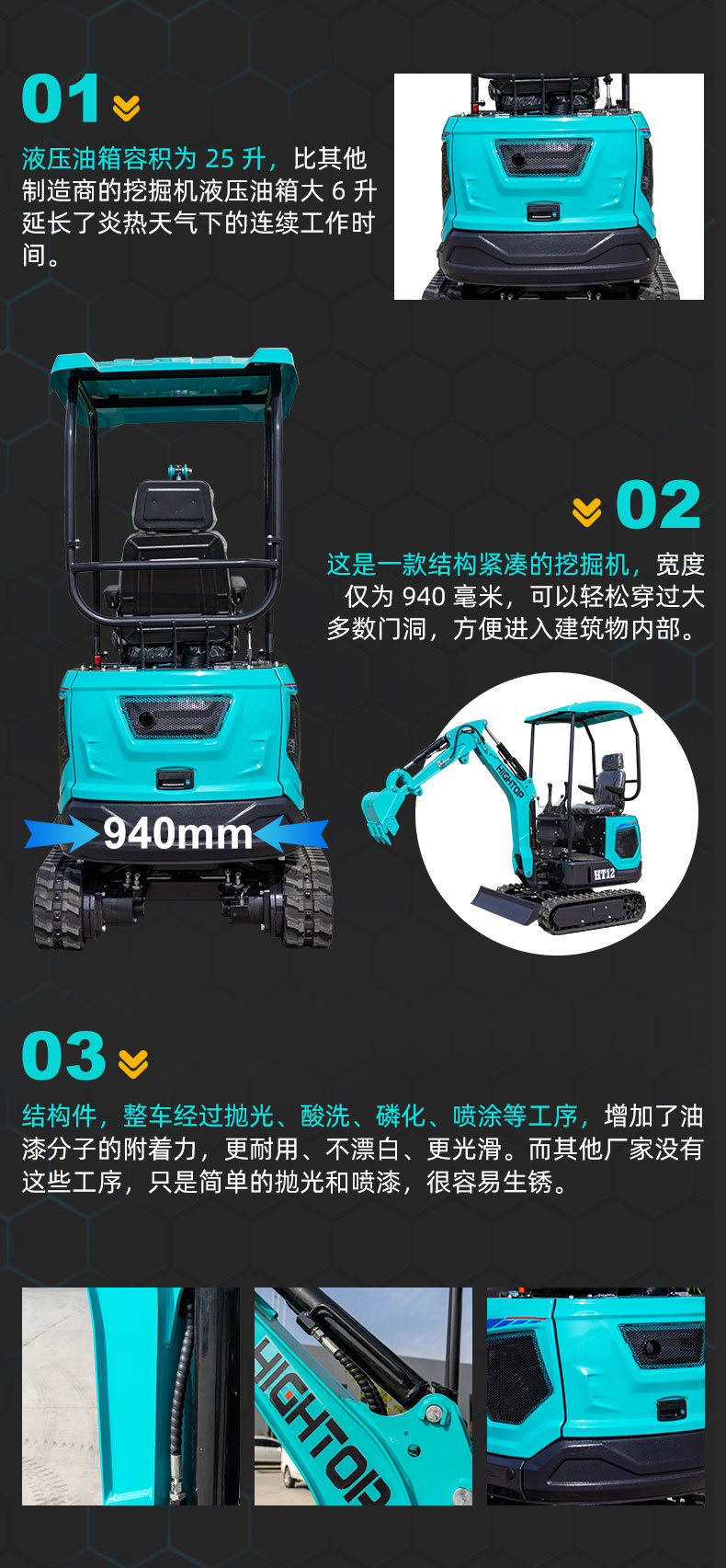 HT12 1200kg 小型挖掘機(jī)液壓油箱容積為 25L,比其他制造商的挖掘機(jī)液壓油箱大 6 升,延長(zhǎng)了炎熱天氣下的連續(xù)工作時(shí)間。